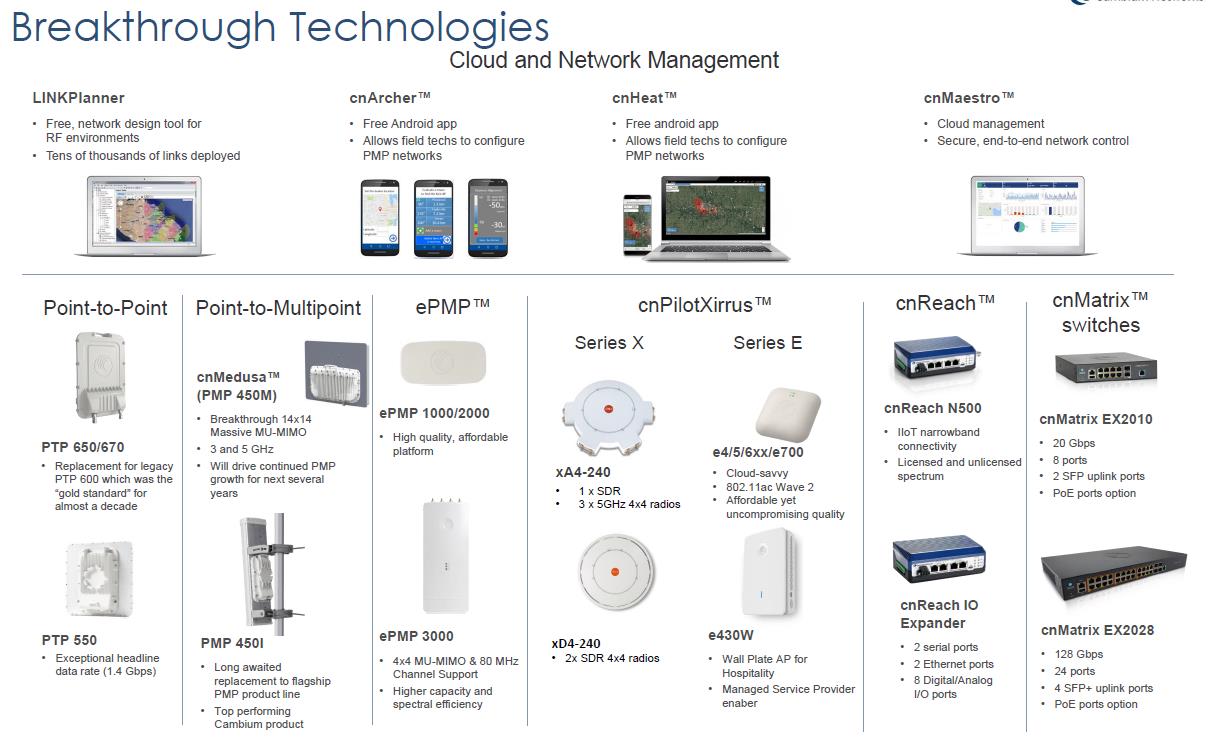 La gama de productos de cambium networks nos permite ajustarnos a los requerimientos actuales del mercado y a las tendencias más actuales, permitiendo que sus productos sean utilizados para diferentes soluciones.