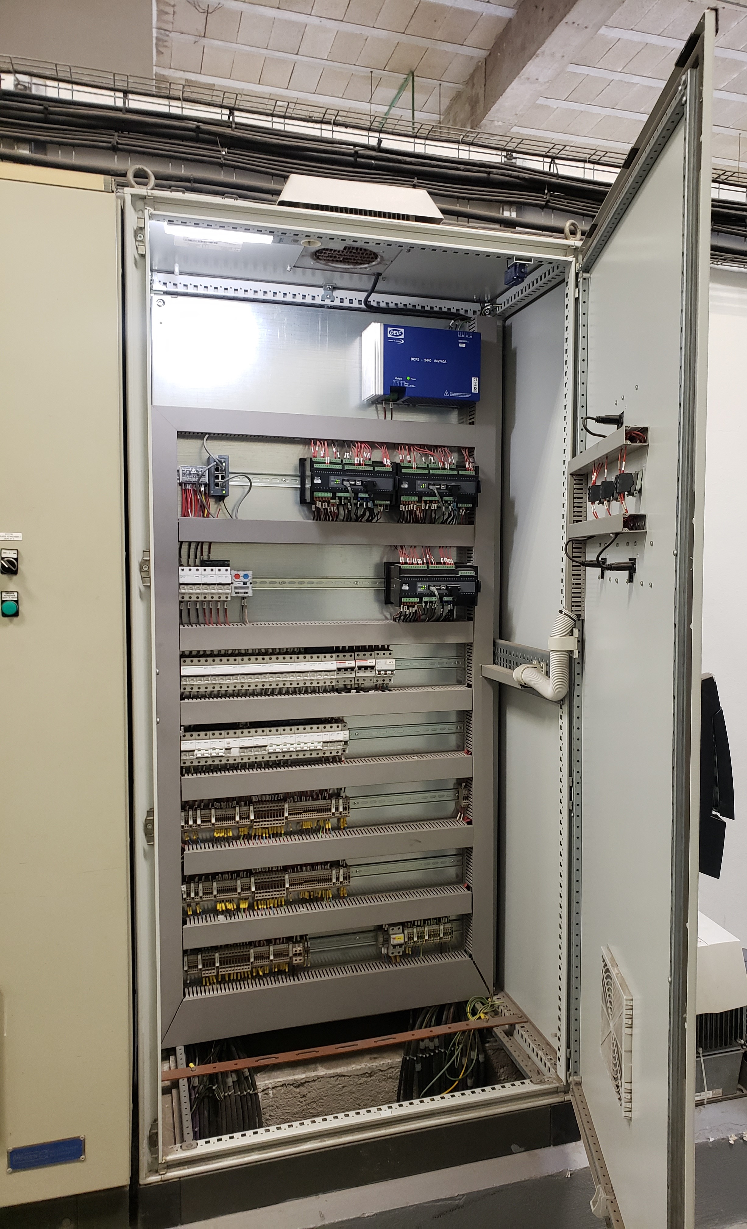 Vista interior del tablero de transferencia donde se muestran los equipos de transferencia con sincronización automática, un equipo Deif mains, dos Deif para control de motores Guascor, 3 deif para control de motores Caterpillar, un PLC Siemens s7 1200 para el control de cargas (deslastre y reconexión), monitoreo de parámetros de trabajo, maniobra para apertura y cierre de cabinas, cargadores de baterías y arrancadores suaves para los ventiladores de los grupos de emergencia.