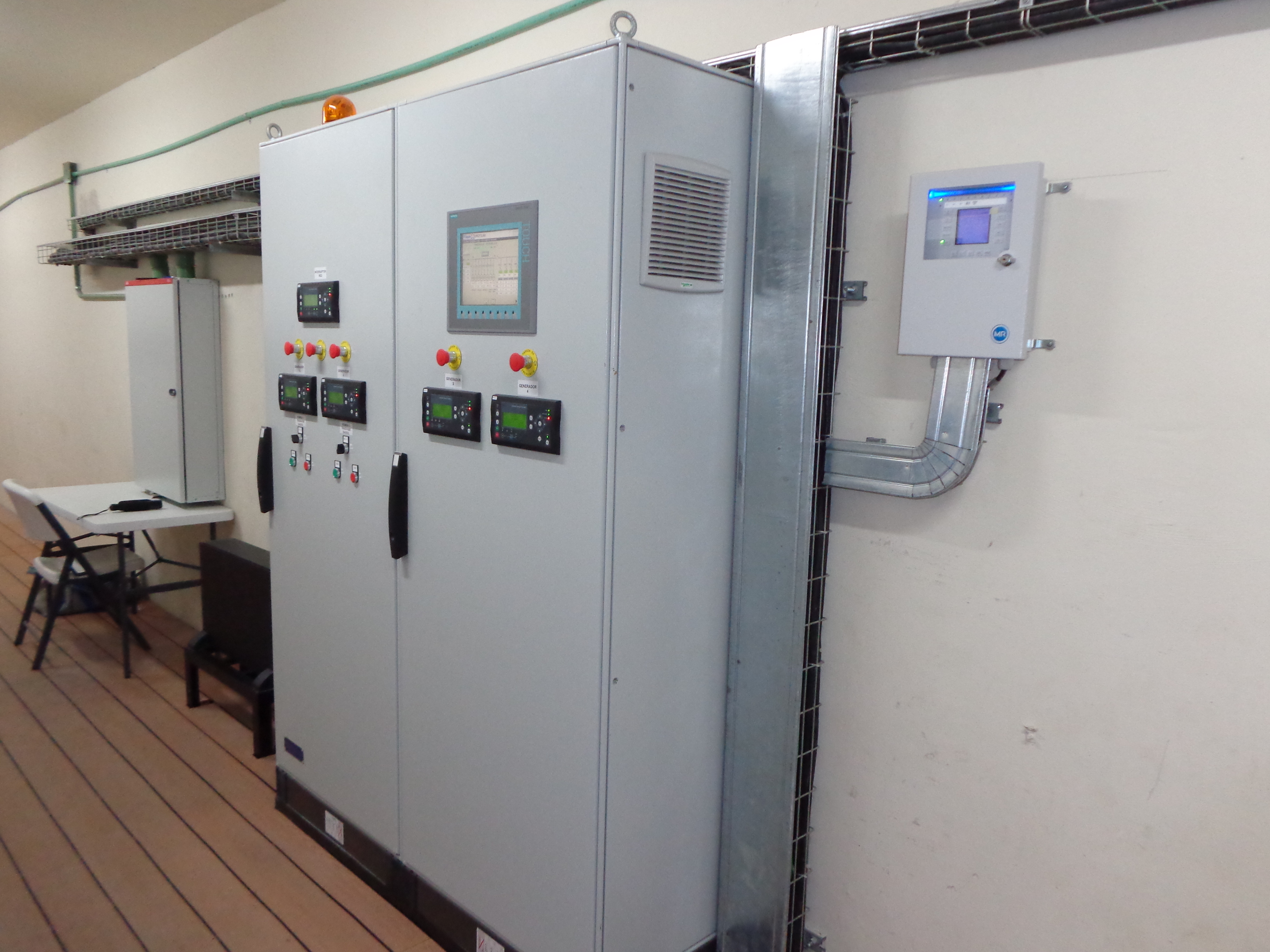 Vista de un tablero donde se muestran los controladores AGC-4 Deif, una pantalla HMI Siemens, zetas de parada de emergencia, pilotos luminosos y selectores de 3 posiciones (manual, paro, automatico).