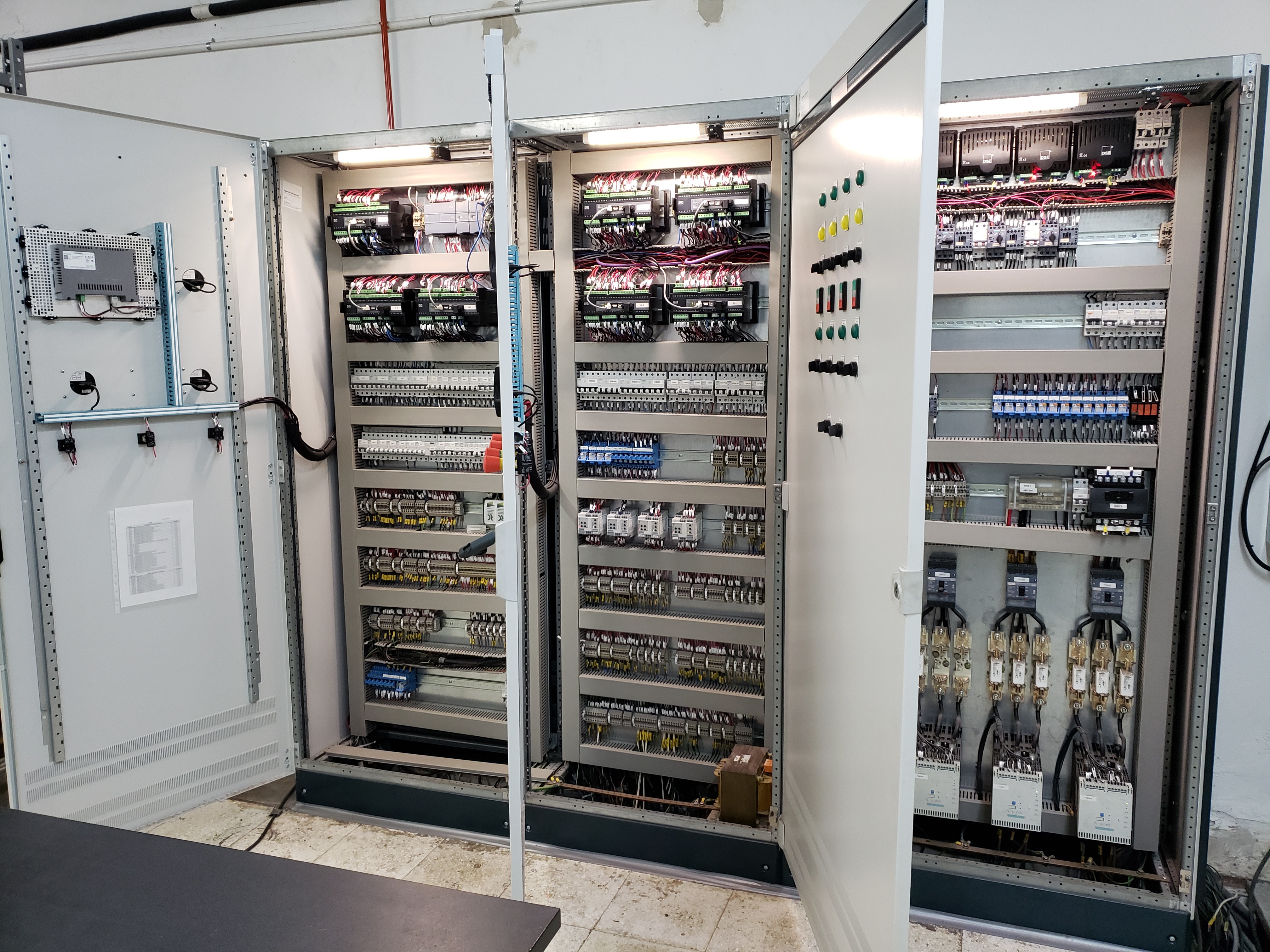 Vista interior del tablero Siemens modelo Sivacon donde se muestran los equipos de transferencia con sincronización automática, un equipo Deif mains, cuatro Deif para control de motores Guascor, dos deif para control de motores Caterpillar, un PLC Siemens s7 1200 para el control de cargas (deslastre y reconexión), monitoreo de parámetros de trabajo, maniobra para apertura y cierre de cabinas, cargadores de baterías y arrancadores suaves para los ventiladores de los grupos de emergencia.
