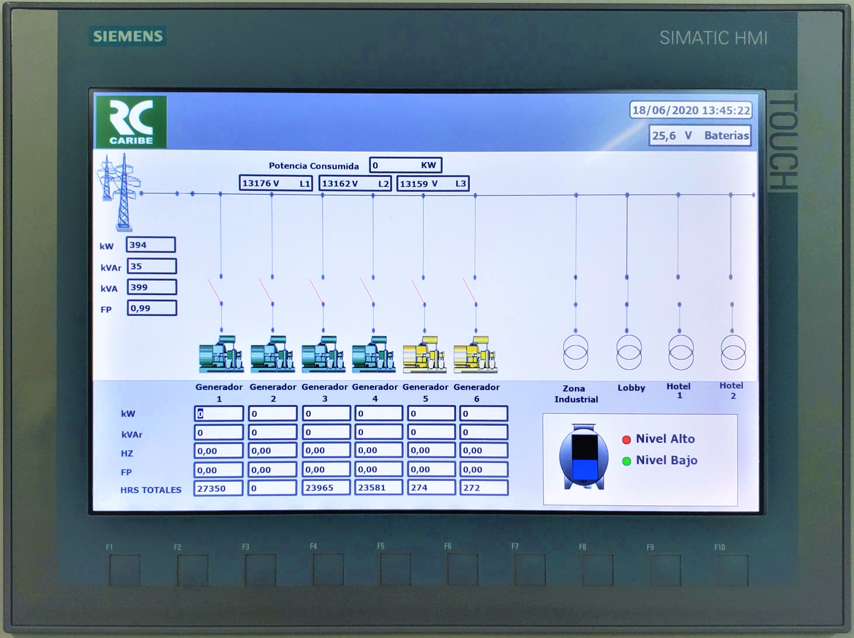 Pantalla Siemens Simatic comfort panel 14" donde se muestran los parametros de trabajo como voltajes, corrientes, potencias, consumo de energia, estado de los interruptores, monitoreo del nivel de combustible, temperatura de agua, presion aceite, alarmas y otros parametros.